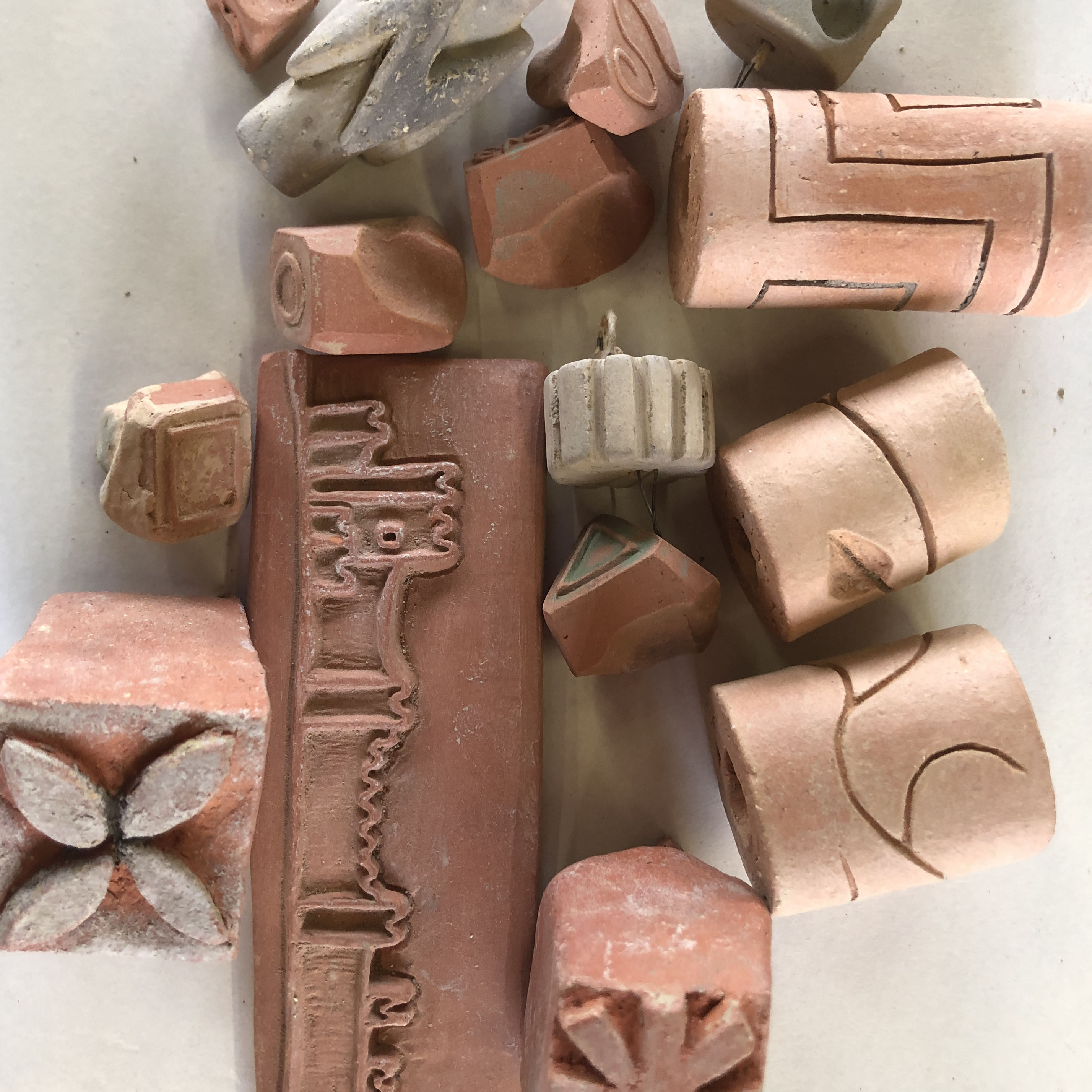 Existem vários tipos de carimbos que podemos fazer, inclusive de barro (chacotar antes de usar), quer sejam pequenas cunhas, rolos ou placas.