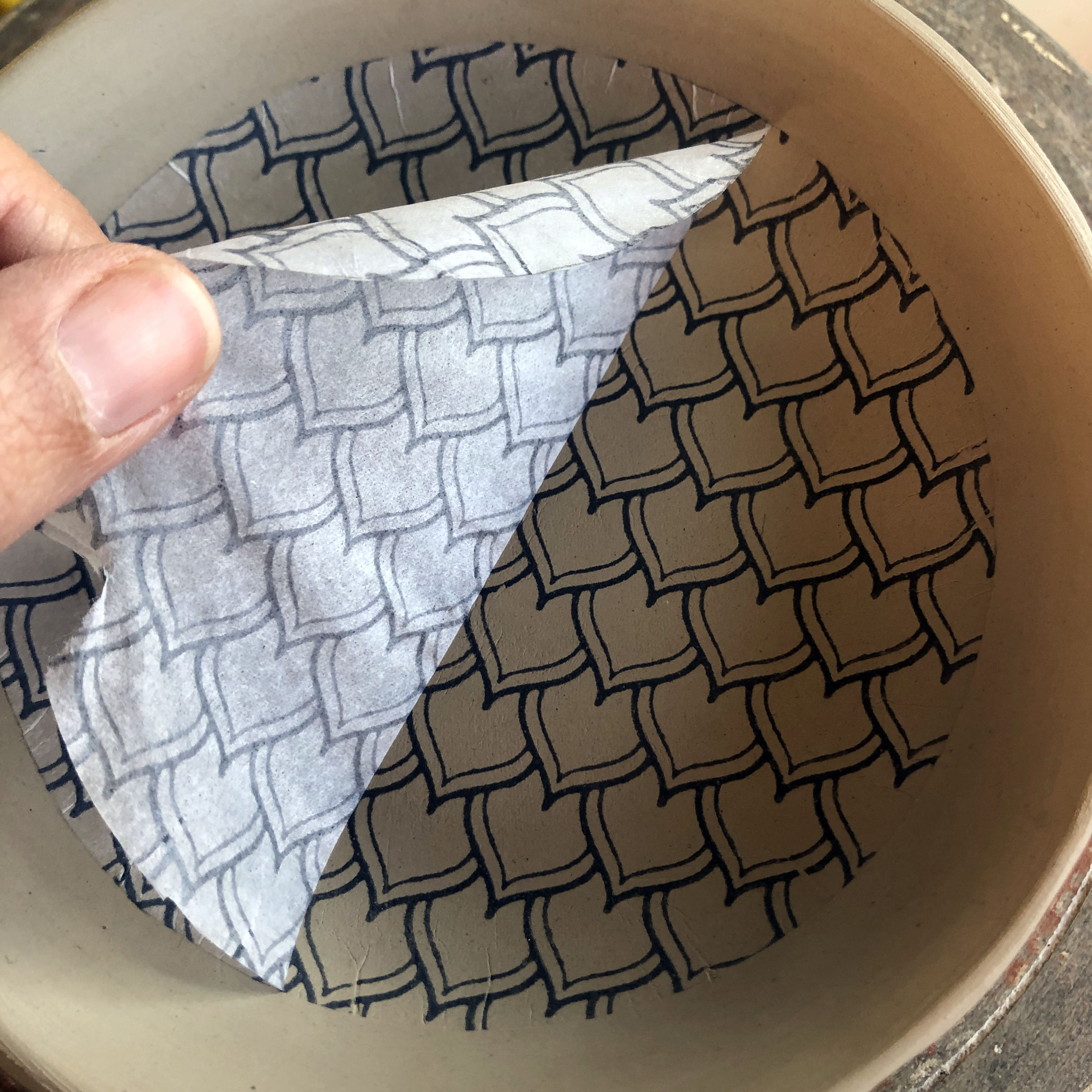 Os decalques de underglaze são impressos a partir do processo de serigrafia e são posteriormente estampados na superfície do barro, como já foi dito, em estado de couro. Podemos recortá-los e usá-los para fazer composições ou preencher as áreas escolhidas.