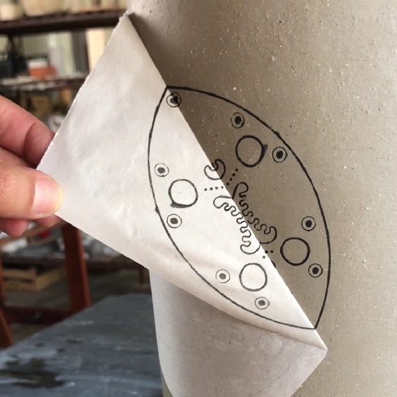- Papel tipo newspaper: para a aplicação devemos humedecer o decalque com uns borrifos de água antes de o aplicar (nas costas do papel e não diretamente sobre a tinta), mas temos de esperar até que o papel perca o brilho, caso contrário o excesso de água vai fazer o desenho esborratar. De seguida aplicamos o decalque e passamos com um rim sobre o papel para transferir bem a tinta para o barro. Se o barro estiver duro demais, a tinta não se transfere tão facilmente e temos de insistir (podemos levantar um canto do decalque e confirmar se a tinta saiu toda, se não saiu voltamos a pousar o decalque e continuamos a passar o rim). Humedecer o papel com uma esponja húmida pode ajudar. Mas a água a mais, quer seja no papel ou a que adicionamos com a esponja, vai esborratar a imagem (principalmente se o barro estiver mais mole, essa água também conta).