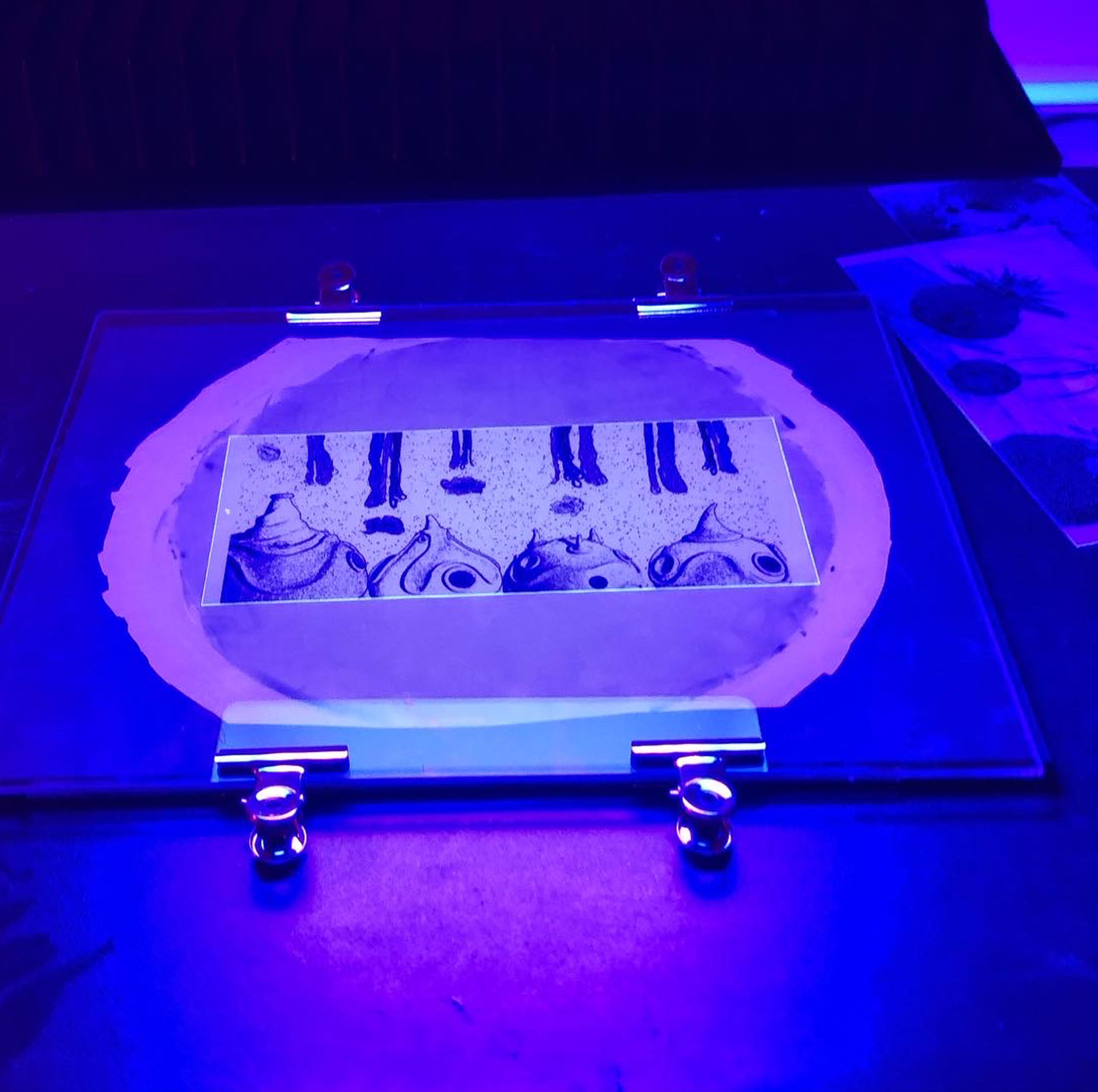 - O fotolito e a malha devem estar presos entre dois vidros (ou pelo menos um vidro em cima) com molas. De baixo para cima, nesta oficina vamos usar: Feltro preto, vidro, cartolina preta, malha com a emulsão seca, fotolito, vidro.
